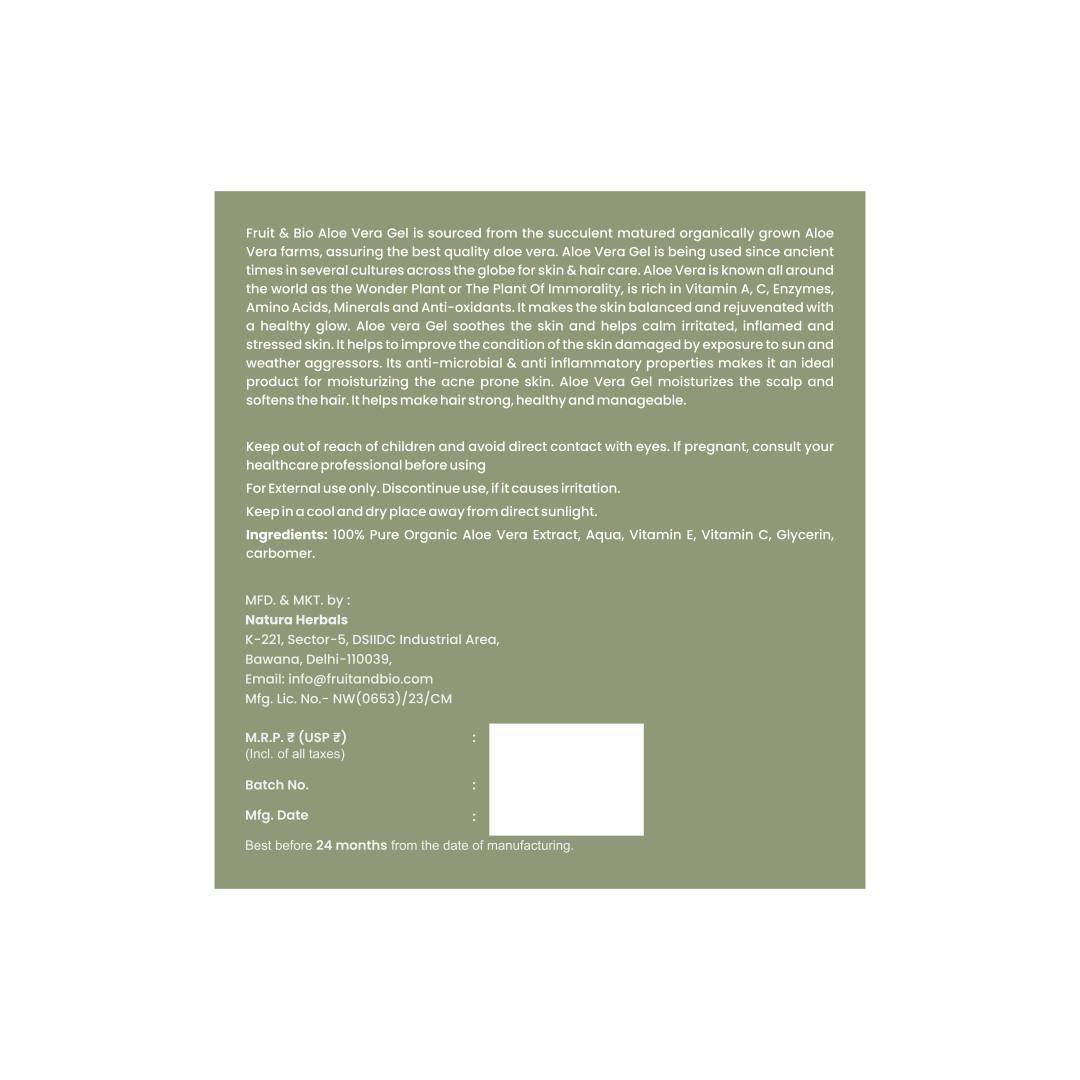 Fruit & Bio Aloe Vera Gel is sourced from the succulent matured organically grown Aloe Vera farms, assuring the best quality aloe vera. Aloe Vera Gel is being used since ancient times in several cultures across the globe for skin & hair care. Aloe Vera is known all around the world as the Wonder Plant or The Plant Of Immorality, is rich in Vitamin A, C, Enzymes, Amino Acids, Minerals and Anti-oxidants. It makes the skin balanced and rejuvenated with a healthy glow. Aloe vera Gel soothes the skin and helps calm irritated, inflamed and stressed skin. It helps to improve the condition of the skin damaged by exposure to sun and weather aggressors. Its anti-microbial & anti-inflamatory properties makes it an ideal product for moisturizing the acne prone skin. Aloe Vera Gel moisturizes the scalp and softens the hair. It helps make hair strong, healthy and manageable.